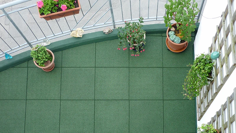 Las placas de granulado de goma son ideales para balcones porque son resistentes a la intemperie, duraderas y de bajo mantenimiento. Su superficie antideslizante ofrece una adherencia óptima incluso en condiciones húmedas, y su estructura elástica proporciona una comodidad superior al caminar. Además, absorben el ruido de los pasos, lo que contribuye a un ambiente agradable en edificios de viviendas.