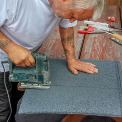 For more complex cuts, such as precisely fitting a natural stone wall, it is helpful to first make a template out of cardboard and then transfer it to the granulate sheet.