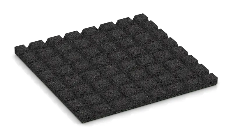 Fabricada con granulado de caucho aglomerado con poliuretano, la loseta presenta una superficie porosa, antideslizante y segura incluso en condiciones húmedas. Es resistente a la intemperie, permeable al agua, aislante acústico y cómoda al tacto. La parte inferior está especialmente estructurada con formas de pirámide invertida que mejoran la amortiguación, facilitan el drenaje y aceleran el secado de la superficie.