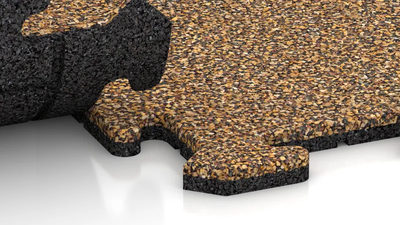 Para que una superficie sea no solo funcional sino también visualmente uniforme, las losetas de esquina HD se producen siempre a partir de las mismas losetas fabricadas para cada pedido – con idéntico diseño de color, densidad y material. Esto garantiza un acabado final armónico y de alta calidad.