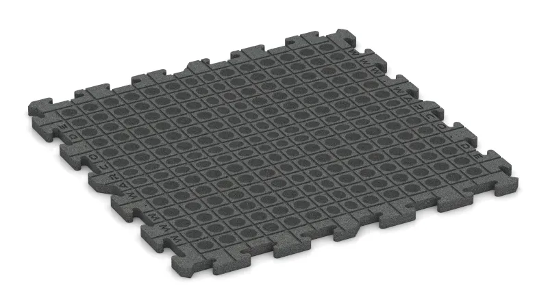 Dos lados de la loseta tienen un perfil positivo, y los otros dos un perfil negativo correspondiente. Al instalarse, las losetas se encajan mecánicamente por la parte inferior, formando una unión firme y duradera. La superficie resultante es continua y uniforme, con un patrón de juntas regular similar a un tablero de ajedrez.